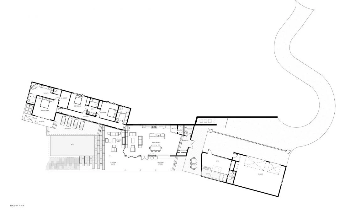 This private single-family home is nestled on a hillside on Signal Mountain. The site is steep and presented some unique challenges when coupled with the client’s program and wishes. Tinker Ma chose to work with the existing topography, rather than compete against it. The resulting project, indoor and outdoor spaces alike, snakes along the contours of the land. The home is relatively invisible from the street and opens up views from within to the outdoor living spaces, including a swimming pool, mountainous views, and adjacent ravine on what would normally be considered the rear of the building.